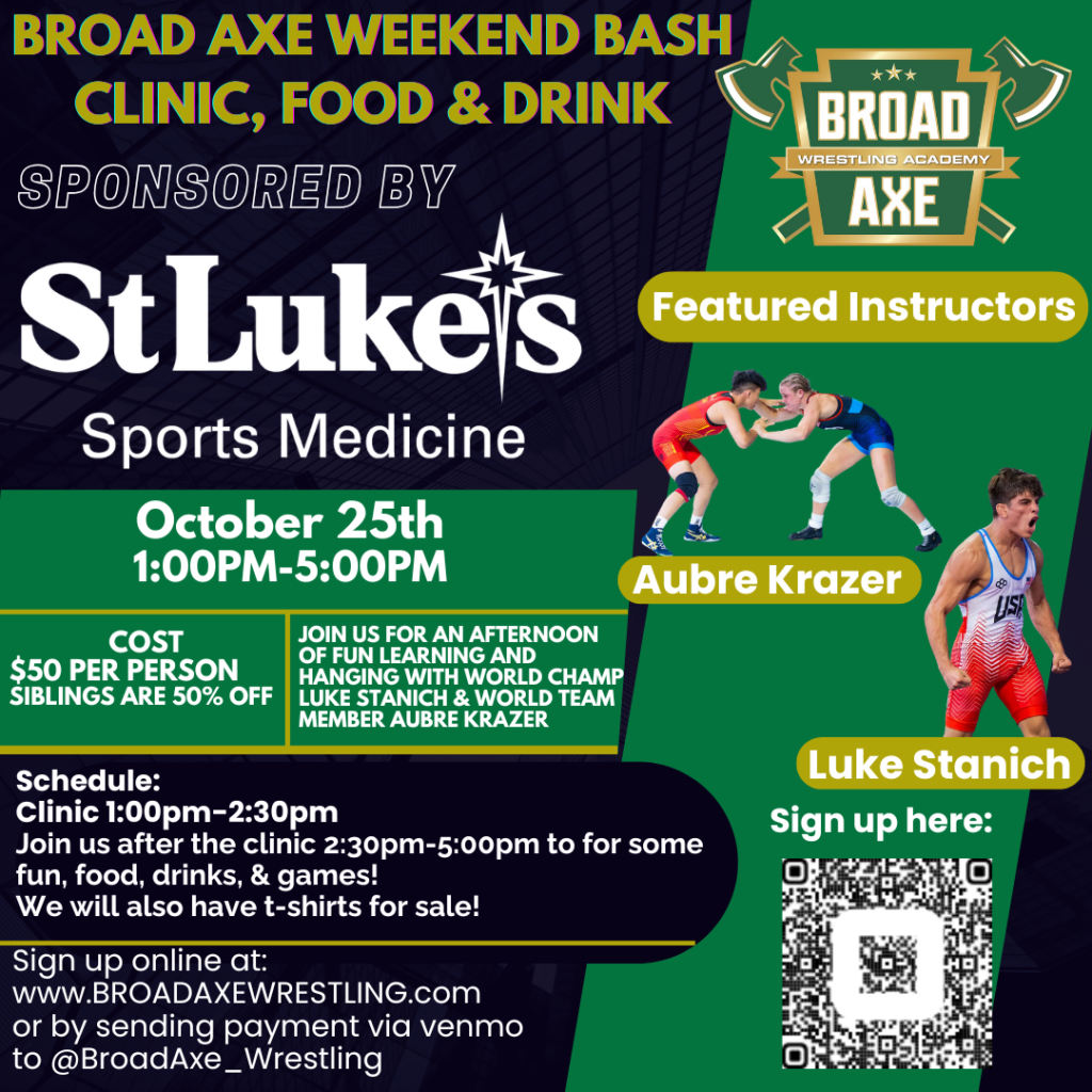 The mat is calling, and spots are vanishing fast! Join us for the Broad Axe Weekend Bash, an electrifying wrestling clinic and social extravaganza sponsored by St. Luke’s Sports Medicine. Happening Saturday, October 25th, from 1:00 PM to 5:00 PM at Broad Axe Wrestling Academy, this is your prime opportunity to train with elite athletes, refuel with friends, and gear up with exclusive merch. But hurry – we’re capping attendance at the first 50 wrestlers only to ensure an intimate, high-impact experience. Once they’re gone, they’re gone!