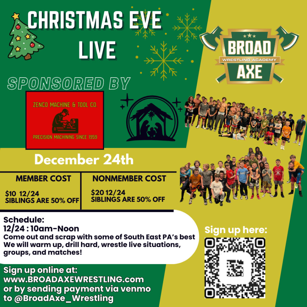 Come scrap with some of South East PA’s best on Christmas Eve! We’ll warm up, drill hard, wrestle live situations, groups, and matches—perfect way to stay sharp over the holidays.